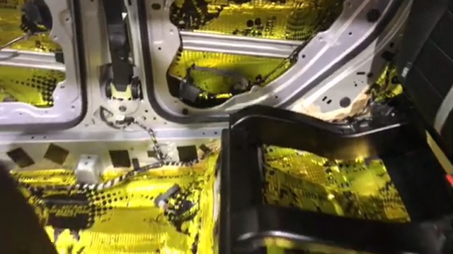 Правильная комплексная шумоизоляция всегда включает в себя предварительную виброизоляцию поверхностей - ведь какой смысл клеить мягкий шумопоглощающий материал на огромные и звенящие от каждого постукивания плоскости? Для начала нужно обезжирить поверхность и очистить ее от всевозможных загрязнений. Затем подготовить материал точно по размеру той плоскости, куда он будет наклеиваться. Прогреваем материал и укладываем на горячую, затем сразу же тщательно прокатываем валиком, чтобы выгнать весь воздух и обеспечить максимальное прилегание. Ну а что получается в результате данных действий - можете оценить по видео. Вам откроется царство сверкающих золотистых кусков виброизоляции, раскатанных по всему салону!