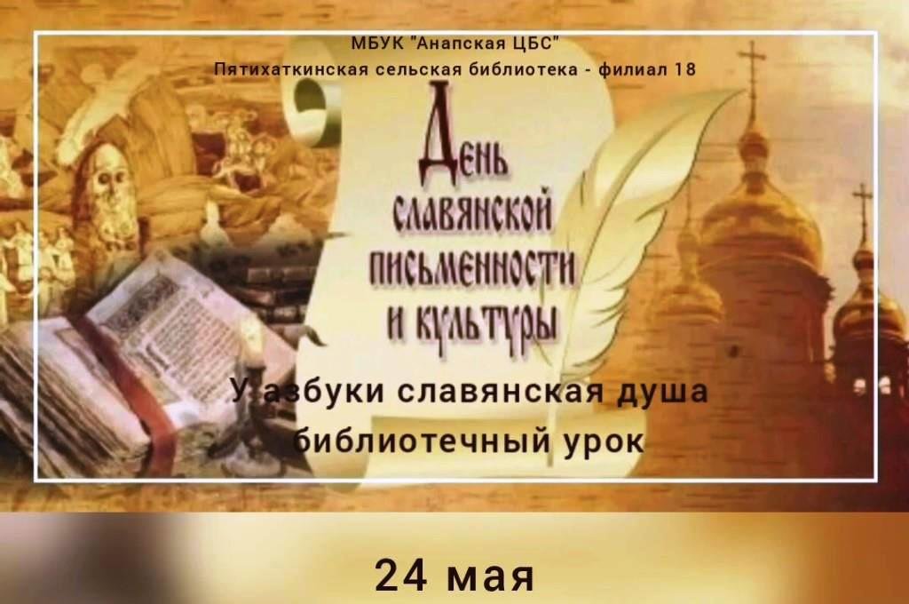 Ежегодно в день памяти святых равноапостольных братьев Кирилла и Мефодия наша страна отмечает День славянской письменности и культуры. Труды этих великих просветителей стали общим достоянием всех славян, положили основу их нравственному и умственному развитию. 24 мая Пятихаткинская сельская библиотека филиал № 18 совместно с ДК «Пятихатки» провели библиотечный урок «У азбуки славянская душа». В фойе библиотеки была оформлена книжная выставка с таким же названием. На выставке были представлены книги на церковно – славянском языке, детские церковно - славянские азбуки, а также прописи с древними буквами, такими, как их придумали св. Кирилл и св. Мефодий. После просмотра и беседы по материалам выставки дети прошли в читальный зал, где для них была приготовлена презентация. Посетили мероприятие монахи Кирилл и Мефодий и побеседовали с детьми о русском языке и нравственности. После этого у ребят была возможность самим попробовать написать древние славянские буквы. Дети узнали много новой и полезной информации и остались очень довольны. Главный библиотекарь Пятихаткинской сельской – библиотеки - филиала № 18 МБУК «Анапская ЦБС» Сергеева Т. В