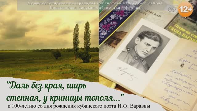 5 февраля 2025 года исполняется 100 лет со дня рождения кубанского поэта Ивана Фёдоровича Вараввы. Это значительная дата для культуры Кубани и России в целом, так как его творчество олицетворяет дух времени и самобытность нашего региона. Творчество Вараввы отражает богатство и разнообразие русского языка, его стихи наполнены глубокими мыслями о природе, любви и жизни. В честь юбилея детская библиотека подготовила видеообзор жизни и творчества «казачьего Пушкина» - Вараввы Ивана Фёдоровича. Н.Когтева, гл.библиограф