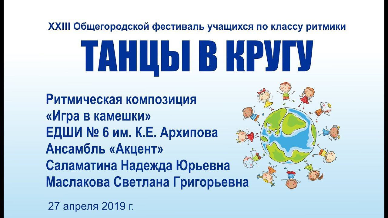Танцевальная композиция «Игра в камешки» ЕДШИ № 6 имени К.Е. Архипова ансамбль «Акцент» Саламатина Надежда Юрьевна Маслакова Светлана Григорьевна XXIII Общегородской фестиваль учащихся школ искусств «ТАНЦЫ В КРУГУ» «КАЛЕЙДОСКОП РИТМОВ» 27 апреля 2019 года