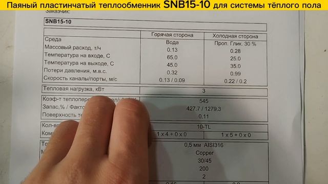 https://www.ozon.ru/product/payanyy-teploobmennik-snb15-10-3kvt-dlya-teplogo-pola-20-m2-1394358705/ Паяный пластинчатый теплообменник SNB15-10 мощностью 3 кВт для системы теплого пола. Аппарат обладает следующими характеристиками: 1. Тепловая нагрузка: 3 кВт 2. Площадь отопления теплого пола 20 м2 3. Горячая сторона. Вход: 65С, Выход: 45С 4. Холодная сторона Вход: 35С, Выход: 25С Массовый расход 0,28 т./ч. 5. Патрубки: Ду20 (3/4 дюйм), наружная резьба 6. Поверхность теплообмена (0,11м2) - 10 пластин 7. Уплотнения из EPDM вставного типа ✅ Пластины теплообменника изготовлены из нерж. стали - AISI316 ✅ Высокие рабочие характеристики: макс. рабочее давление - 16 бар., макс. рабочая температура - 150С. ✅ Гарантия 3 Года ✅ Разборная конструкция позволяет легко промывать и обслуживать теплообменник. Мы производим пластинчатые теплообменники с 2009 года, поэтому можем предложить вам лучшие условия: ? - Предложим цену на 30% ниже рынка! ??️ - Изготовим ваш теплообменник за 1 день! ? - Надежно упакуем и доставим оборудование на ваш объект! ?? - Доставим теплообменник в любую точку России! ? - Расчет теплообменников ведется в сертифицированной программе расчета. Подберем на любую мощность и посчитаем за 15 минут! ? - Постоянная сервисная поддержка!