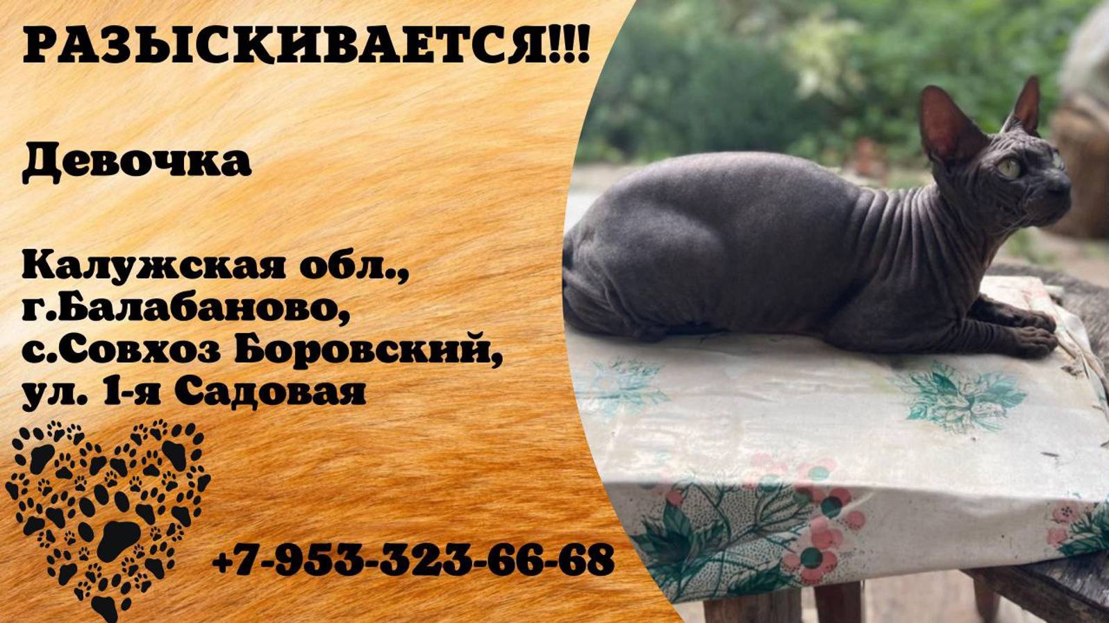 Калужская Балабаново Пропала кошка ПРОПАЛА КОШКА!!!!!13 августа вечером пропала с дачного участка и не вернулась. Никогда не уходила далеко от дома, а тем более так надолго. Территориально пропала с. Совхоз Боровский ,ул.1-я Садовая. Стерилизована. Очень ждем её дома! УМОЛЯЮ!!! Если кто-то обладает информацией, о ее нахождении или "по-ошибке" взял ДАЙТЕ ЗНАТЬ!!! ПОЖАЛУЙСТА!!!!! 8(953)-323-66-68 Екатерина Инфо: https://vk.com/wall-198815410_149426 Автор: https://vk.com/id78771537