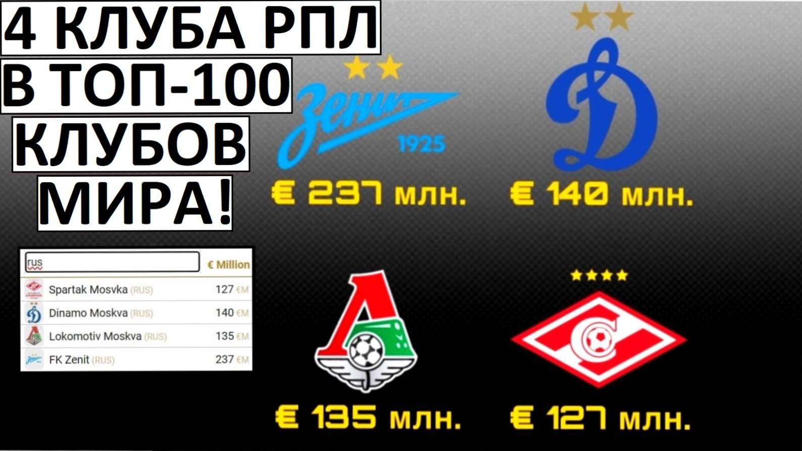 Спартак, Зенит, Локо и Динамо - в топ-100 самых дорогих команд мира!
