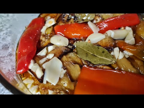 МАРИНАТ: ВОДА: 300МЛ сахар : 2 о 3 ст ложки СОЛЬ:1СТ ЛОЖКИ УКСУС: 2 СТ ЛОЖКИ ЧЕСНОК 2 ШТ ПЕРЕЦ ГОРОШЕК:5 -6 ШТ МАСЛО РАСТИТЕЛЬНОЕ: 2 ЛОЖКИ СТ ЛАВРОВЫЙ ЛИСТЬЯ:2 ШТ РЕЦЕПТ: БАКЛАЖАНЫ 3 ШТ ПЕРЕЦ БОЛГАРСКИЙ 3 ШТ ЧЕСНОЕ 8 ШТ МАСЛО ДЛЯ ЖАРКИ РАСТИТЕЛЬНОЕ: