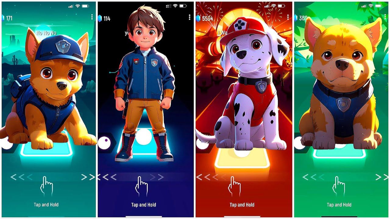 Мультики для Детей Щенячий Патруль АНИМЕ Tiles Hop - ГОНЩИК, РАЙДЕР, МАРШАЛЛ, КРЕПЫШ