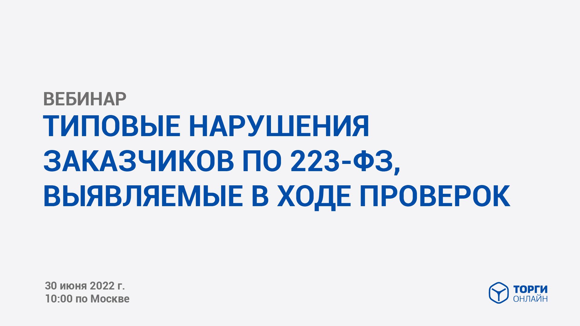 Как избежать частых нарушений по закону 223-ФЗ выявленных в ходе проверок. Когда Вас будут ждать проверки и какие Запись вебинара от 30.06.2022 ПРОГРАММА ВЕБИНАРА - Виды проверок и случаи их проведения - Кто может проверять заказчиков по 223-ФЗ - Обзор результатов заключений ФАС по итогам проверок - Возможные действия, за осуществление которых возможно назначение штрафа - Ответы на вопросы Преимущества размещения закупок на ЭТП ТОРГИ-ОНЛАЙН по ссылке https://torgi-online.com/zakazchikam/