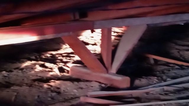 Залез проверить стойки, балки, стропилы. Покрытие шифер (СССР), сам материал "листвяк", установлено в середине 1980-ых. Сверху снега навалилось, в соседнем доме крышу проломило, в прошлом году снега было много, да и по городу у нескольких домов крыши не выдержали снег.