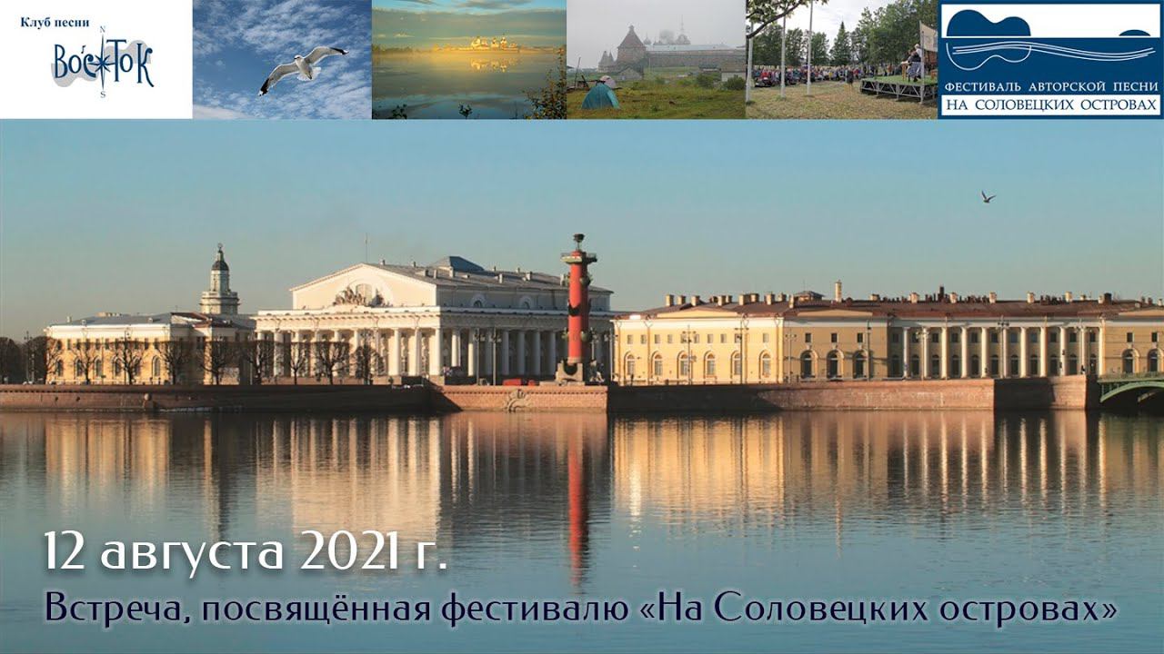 Встреча в zoom'е, посвящённая фестивалю «На Соловецких островах». Клуб песни «Восток». 12 августа 2021 г. Санкт-Петербург, Московский пр., 189. Ведущие - Мария Демина и Валентин Вихорев. Подготовка видеоматериалов - Алла Левитан и Герман Колосов. Видеозапись - Алла Левитан. Запись звука - Геннадий Демин. Обработка звука - Герман Колосов. Заставка - Лада Вихорева. Мелодия песни Валентина Вихорева «На Соловецких островах» в обработке Сергея Ильина. 0:01:05 Татьяна Зорина 0:04:34 Валентин Вихорев 0:05:22 Все участники. На Соловецких островах… (В. Вихорев) 0:11:41 Валентин Вихорев. Мише Семененко (В. Вихорев) 0:12:18 Валере Чечету (В. Вихорев) 0:14:00 Борис Щеглов (г. Москва). 0:15:39 Опять бинты промокли... (Б. Щеглов) 0:17:40 На земле, пропитанной страданием... (Б. Щеглов) 0:18:34 Колокола (Б. Щеглов) 0:21:55 Лидия Березнякова. Осиротевшим (Л. Березнякова) 0:24:11 Николай Грахов (г. Уфа). Фотография (Н. Грахов) 0:25:58 На Цыганскую поляну... (Н. Грахов) 0:29:38 Владимир Шемшученко (г. Всеволожск Лен. области). Ветер нынче строптив... (В. Шемшученко) 0:31:00 Владимир Шемшученко и Сергей Ильин. Соловки (В. Шемшученко) 0:34:00 Как хорошо... (В. Шемшученко) 0:38:24 Сергей Ильин. Над Кубанью туман... (муз. С. Ильина на ст. В. Шемшученко) 0:42:27 Дуэт «Рассвет»: Светлана Широва и Юлиан Афанасьев. Фантастика-романтика (Юлий Ким), 0:44:18 Гуси круг над лугом сделали... (Александр Добров) 0:47:39 Михаил Каплунов (США, Лос-Анжелес). Белая ночь (М. Каплунов) 0:51:51 Такие времена... (муз. М. Каплунова на ст. М.-А. Меламед) 0:55:39 Елена Листова. Соловецкие острова (Е. Листова) 0:56:17 Вот так живёшь себе тихонечко на свете... (Е. Листова) 0:59:56 Андрей Стрелков. Совсем простая песня (А. Стрелков) 1:02:48 Ирина Соловьёва. Океан (И. Соловьёва) 1:03:54 Там тихо плещется река... (И. Соловьёва) 1:04:48 Продавалось счастье (И. Соловьёва) 1:05:50 Ансамбль «Откровение» (г. Старая Русса): Ольга Степанова (скрипка), Наталья Повидыш, Светлана Никитина, Анастасия Яковлева, Анжелика Зевакина, Алексей Афанасьев (гитара). Соловки (Светлана Меликьянц); 1:10:08 Музыкант (Булат Окуджава) 1:13:12 Владислав Блюм. Замечания (В. Блюм) 1:15:00 Крайняя песенка (В. Блюм) 1:18:27 Вячеслав Ковалёв. Взрослеет человек (В. Ковалёв) 1:24:00 Александр Софронов (г. Москва). Листья поворошить (муз. А. Софронова на стихи Тейт Эш) 1:27:41 Татьяна Ёгина (г. Кострома). Безветрие (Михаил Букреев) 1:30:52 Тейт Эш (Крым). До выходных (Тейт Эш) 1:35:16 Мария и Геннадий Демины – Не клонись-ка ты, головушка (Б.Окуджава); 1:38:45 Лети, душа (В.Чечет) 1:43:10 Нина Скалка (г. Смоленск). Мечты любителя географии (муз. Нины Скалки на стихи Андрея Потылико) 1:48:44 Сергей Ильин. Соловецкая песенка (муз. С. Ильина на ст. И. Валуй) 1:50:57 В густой траве схоронись... (муз. С. Ильина на ст. А. Блока) 1:55:08 Владимир Фатеев. Возвращение (Евгений Клячкин) 2:00:00 Соловецкий романс (муз. В. Фатеева на ст. Елены Костиковой) 2:03:15 Евгений Гурин (г. Нижний Новгород). Вопрос – ответ (Е. Гурин) 2:07:01 Вениамин Грузинов (г. Москва) 2:09:43 Макариевская Пустынь (стихи В. Грузинова) 2:13:47 Инга Макарова. Я - кто? Что со мной?.. (И. Макарова) 2:15:34 Я карабкаюсь через годы... (И. Макарова) 2:16:21 Хвост (И. Макарова) 2:17:40 Недовыросшие пионеры... (И. Макарова) 2:20:04 Герман Колосов. Соловецким юнгам (Валерий Боков) 2:24:27 Лада Вихорева, аккомпанирует Герман Колосов. Зимний сон (Евгений Клячкин) 2:28:05 Лада Вихорева и Герман Колосов. Лодочка (Валерий Боков) 2:33:45 Александр Тимофеев и Сергей Ильин. Река (А. Тимофеев) 2:38:33 Серебряный вальсок (А. Тимофеев) 2:42:58 Валерий Боков (г. Казань).