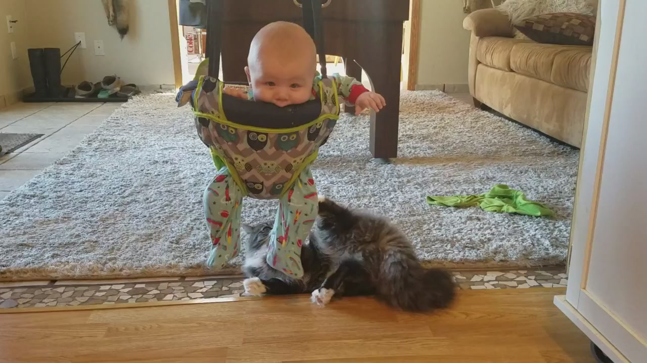 Кот играет с дитём, который подвязан к потолку.