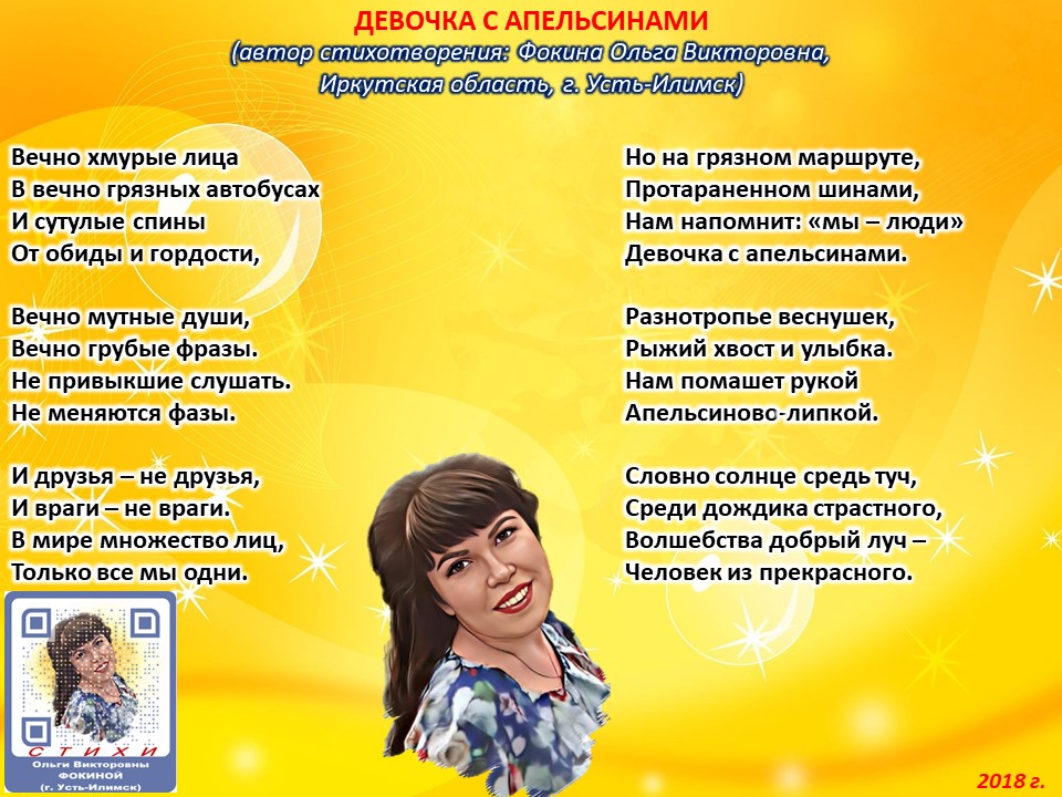 Читает автор стихотворения: ФОКИНА ОЛЬГА ВИКТОРОВНА (Иркутская область, город Усть-Илимск) СТИХИ: https://stihi.ru/2018/07/08/3790 БИОГРАФИЯ: http://www.proza.ru/2019/10/08/1473 ВЫИГРЫВАЙТЕ КНИГИ БЕСПЛАТНО: https://proza.ru/2017/09/17/447 ОТЗЫВЫ ЧИТАТЕЛЕЙ: http://www.proza.ru/2019/11/29/611 Из книги Фокиной Ольги Викторовны (Усть-Илимск) «Несу добро в ладошках!»: [все стихотворения с 2005 по октябрь 2020 гг., проза, авторские песни, интервью]. – Москва: МГО Союза писателей России, 2020 г. – 886 стр., ил. ISBN 978-5-7949-0826-8 ДЕВОЧКА С АПЕЛЬСИНАМИ (автор стихотворения: Фокина Ольга Викторовна, Иркутская область, г. Усть-Илимск) Вечно хмурые лица В вечно грязных автобусах И сутулые спины От обиды и гордости, Вечно мутные души, Вечно грубые фразы. Не привыкшие слушать. Не меняются фазы. И друзья – не друзья, И враги – не враги. В мире множество лиц, Только все мы одни. Но на грязном маршруте, Протараненном шинами, Нам напомнит: «мы – люди» Девочка с апельсинами. Разнотропье веснушек, Рыжий хвост и улыбка. Нам помашет рукой Апельсиново-липкой. Словно солнце средь туч, Среди дождика страстного, Волшебства добрый луч – Человек из прекрасного. 29 августа 2018 г.