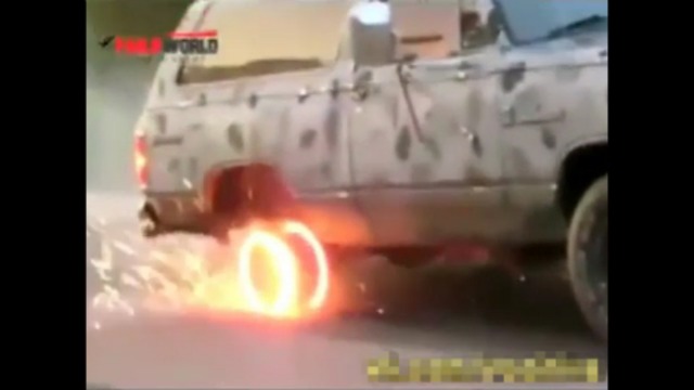 За рулём машины без колеса сидит водитель без головы.