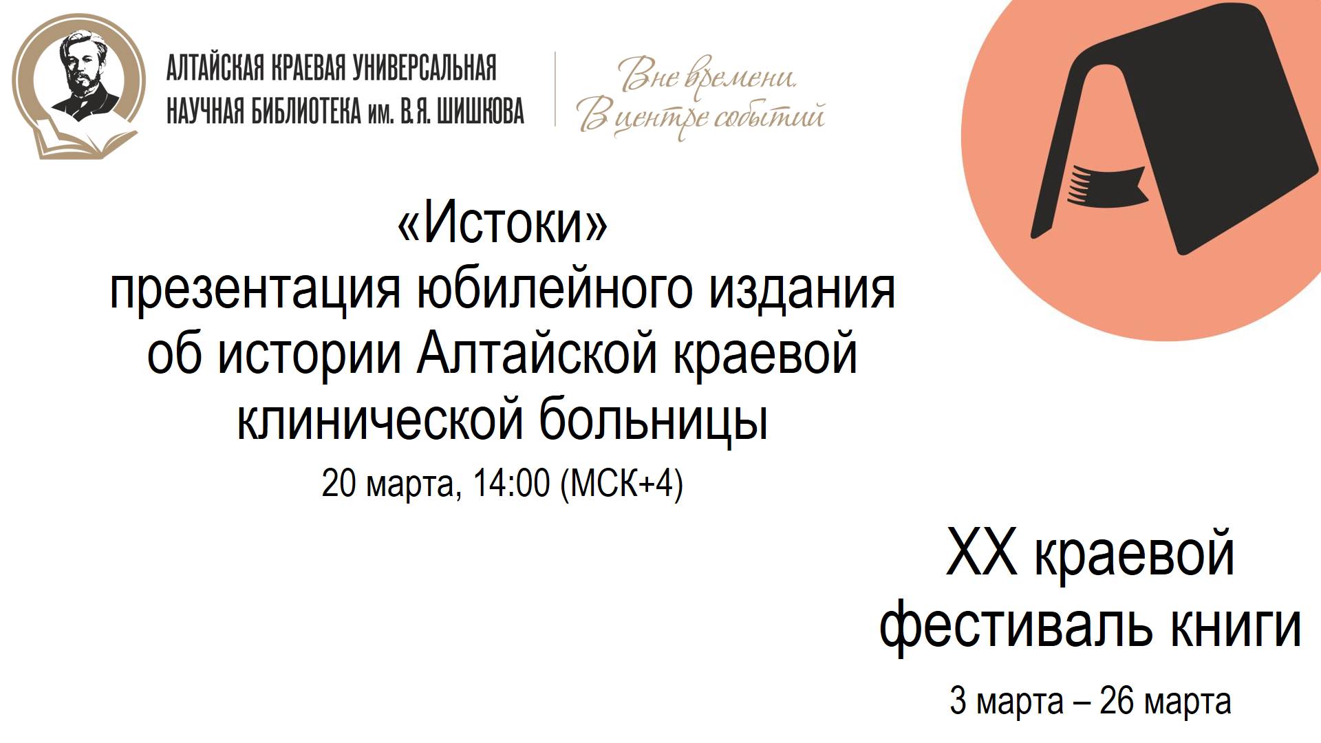 Алтайская краевая универсальная научная библиотека им. В. Я. Шишкова с 2006 г. проводит краевой фестиваль книги «Издано на Алтае» с целью предоставления широкой общественности возможности знакомства с книжными новинками Алтайского края, выявления лучших изданий, развития и поддержки интереса к чтению. Подробнее о фестивале: https://akunb.altlib.ru/festival-knigi-izdano-na-altae/ Онлайн-трансляции мероприятий XX фестиваля «Издано на Алтае»: https://akunb.altlib.ru/2025/02/28/onlajn-translyaczii-meropriyatij-xx-festivalya-izdano-na-altae/ Наши социальные сети: ВК: https://vk.com/akunb ОК: https://ok.ru/akunb.altay Телеграм-канал: https://t.me/shishkovka22
