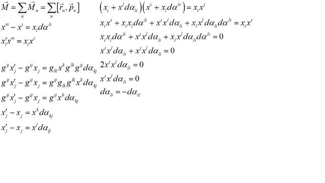 В явном виде получен тензор механического момента частицы. Показано изменение координат при повороте на бесконечно малый угол в 4-мерном пространстве. Показан закон движения системы частиц в свободном пространстве, как целого. Применены операции симметрирования и альтернирования тензора. Указано, что произведение симметричного тензора на антисимметричный всегда дает ноль. Рекомендую проверить знак минус в определении действия и тензора. В разных источниках определения отличаются. Возможна опечатка.