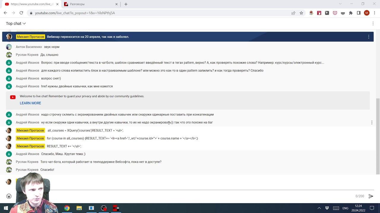 Оказываю услуги в области настроек и доработок WebSoft HCM, hr-автоматизации, дистанционного обучения. mp@mpros.ru Версия WebSoft HCM в этом видео: 2021.4 Тайм-коды: 00:00:00 - Начало вебинара. Настройка. Устранение неполадок (треск). 00:05:40 – Планы будущих вебинаров. 00:07:07 – Анонс текущего вебинара. WebSoft: База знаний 00:07:36 - WebSoft: Поддержка, чат-боты 00:09:33 - 3 типа чат-ботов 00:15:05 - Создание чат-бота на WebTutor (на примере для компании «Феникс») 00:22:10 - Стандартный чат-бот в AIML 00:25:25 - Кнопка перехода на разговор с чат-ботом 00:30:00 - Ошибка в настройке чат-бота 00:31:47 - Устранение ошибки настройки чат-бота 00:33:36 - Создание нового чата 00:46:00 - Как делать запросы к серверу. Количество курсов 00:52:35 - Как вывести список курсов с ссылками 00:57:25 - Ошибка в создании списка и устранение ошибки 01:15:50 - Как сделать меню 01:19:50 – Подведение итогов вебинара 01:20:50 - Анонс вебинара про настройку мобильного приложения, расписание вебинаров, предложения. 01:21:00 – Ответы на вопросы