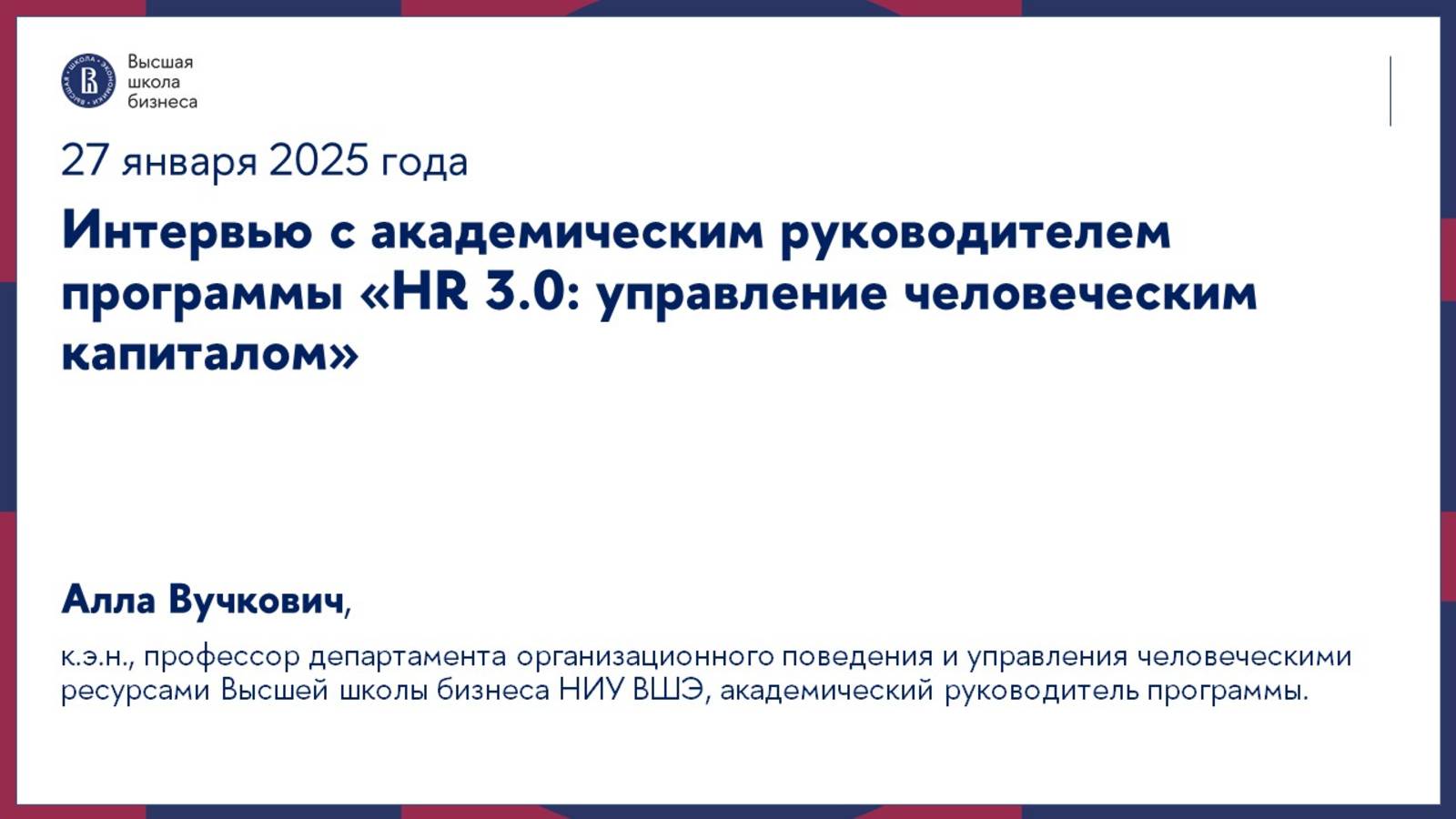 Как рынок труда справляется с кадровым дефицитом, может ли HRD стать членом правления компании и какие практические инструменты для решения актуальных задач дает новая программа Высшей школы бизнеса ВШЭ для HR-специалистов — об этом PR-директор и доцент Высшей школы бизнеса НИУ ВШЭ Андрей Шаромов расспросил академического руководителя программы Аллу Вучкович. Алла Вучкович о современных вызовах в сфере HR, новой программе ВШБ ВШЭ «HR 3.0: управление человеческим капиталом» и переосмыслении подходов к работе с кадрами. Алла Вучкович — профессор департамента организационного поведения и управления человеческими ресурсами Высшей школы бизнеса НИУ ВШЭ, к.э.н., председатель Совета по профессиональным квалификациям в области управления персоналом. Ранее — исполнительный директор по персоналу и социальной политике в корпорации «Роскосмос». Старт обучения по программе – 30 января 2025 года! Страница программы «HR 3.0: управление человеческим капиталом» - https://www.hse.ru/edu/dpo/901230257 Получить консультацию, узнать подробности обучения: opendpo@hse.ru, +7 (495) 628-40-59 #вшб #вышкаДПО #программыДПО #ДополнительноеПрофессиональноеОбразование #Профессиональнаяпереподготовка #HR #управлениечеловеческимкапиталом #hrменеджер #управлениечеловеческимкапиталоморганизации #управлениеразвитиемчеловеческогокапитала #hrдиректор #hrспециалист #эффективныйHR