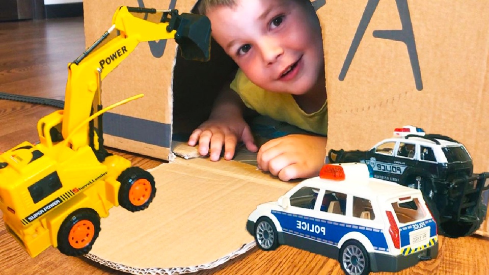 Артемоха играет в машинки и как полицейский спасает пропавшие машинки из катонной коробки