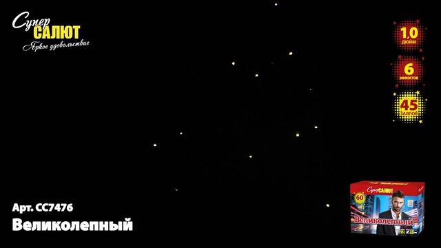 Батарея салютов Великолепный (60/1) СС7476 https://spb-salut.ru/products/velikolepnyy-60 Количество залпов/калибр: 60/1. Время работы до 45 сек. Высота подъема до 30 м. Эффекты: красные и синие жемчужины с мерцанием; пурпурные и зеленые жемчужины с мерцанием; синие и зеленые жемчужины с мерцанием и красными вспышками; белые мерцающие ивы; красные жемчужины, рассыпающиеся разноцветным дождем. Фасовка: 1/2. SPB SALUT - пиротехническая компания в Санкт-Петербурге. Основные направления деятельности: 1) Розничная торговля пиротехникой (офлайн магазины, интернет-магазин spb-salut.ru); 2) Организация и проведение профессиональных фейерверков; 3) Оптовая торговля пиротехникой по всей России. Адреса магазинов: 1) г. Санкт-Петербург, ул. Тележная, д. 15, лит. Б (вход с ул. Кременчугская), м. Площадь Восстания. Ежедневно с 10:00 до 22:00 2) г. Санкт-Петербург, пр. Полюстровский, д. 28Б, м. Площадь Ленина. Ежедневно с 10:00 до 22:00 Благодаря большому опыту, наши специалисты с легкостью создадут для Вас уникальное фейерверк шоу, которое сделает любой Ваш праздник незабываемым, будь то день рождение, свадьба, корпоратив или фейерверк городского масштаба! Почта: info@spb-salut.ru Сайт: https://spb-salut.ru Тел.: +7(812)242-82-24; +7(952)287-80-85.