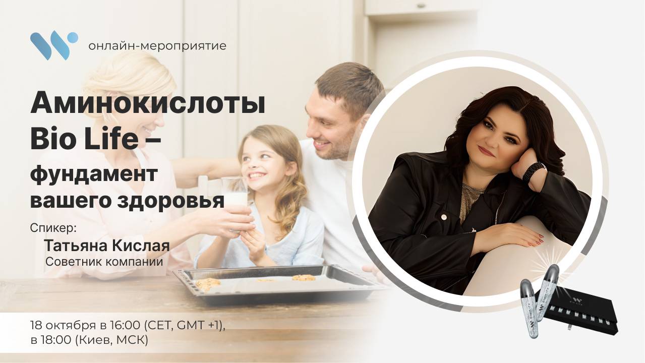 Аминокислоты Bio Life – ваш путь к здоровью и успеху! 🔥 Готовы узнать, как простое решение может стать ключом к здоровью и успешному бизнесу? Приглашаем вас на мастер-класс, который откроет для вас все возможности аминокислот Bio Life! Спикер: Татьяна Кислая — Советник компании WebWellness. 📅 Дата и время: 18 октября в 16:00 (CET, GMT+1) / 18:00 (Киев, МСК). Что вас ждёт: 🔹 Почему именно Bio Life? 🔹 Для кого необходимы аминокислоты и почему они нужны каждому? 🔹 Реальные кейсы и примеры. Это не просто презентация, а настоящий мастер-класс, где вы узнаете все тонкости использования аминокислот для здоровья и узнаете, как строить успешный бизнес на основе продуктов Bio Life. Не упустите шанс – это уникальные знания, которые могут изменить вашу жизнь!