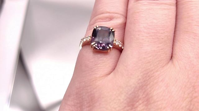 Золотое кольцо с фиолетовой Шпинелью 3.45 ct. и Бриллиантами. Оправа: золото 585 пробы. Место добычи Шпинели - Мьянма. 100% Природный камень, без облагораживания. Чистота Шпинели: VS1:Г2 (Fpt; Ftr). Бриллианты (3/4) - 100% Природные, без облагораживания. Размер Шпинели: 9,3 х 8,4 х 5,4 мм. Размер Бриллиантов: 1,9 мм (6 шт). Размер кольца: 16,9. Вес кольца: 3,16 г J832