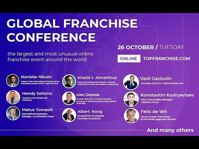 Conference organizers: Topfranchise, global franchise marketplace. THE MAIN THEMES 1. How to sell a franchise in 2021-2022 2. Strategies for achieving results in selling a franchise. 3. Europe. Asia. America. Middle East. Overview of the market situation. Take 3 hours of your time to grow and learn about new opportunities connected with international markets, about which you will hear from interesting speakers, managers of their own franchises and experts in the field of franchising. We have gathered speakers from different parts of our earth: America, Singapore, the Netherlands, Russia, Indonesia, Ukraine, Saudi Arabia, Slovakia. Join us and you will learn a lot about global franchising. The founders of large franchising companies will tell you about their experience in developing a franchise network. - If you already have your own franchise, you will get a lot of tools to develop your business. - If you want to create your own franchise, we will tell you where you should start. - If you want to purchase a franchise, we will tell you about reliable companies with whom you can continue to communicate after the conference. CONFERENCE HEADLINERS 5:54 - Matus Tomasik. International Expansion Manager La Donuteria Group 19:33 - Albert Kong. Founder/CEO of Asiawide Franchise Consultants. 33:27 - Hendy Setiono. Founder & CEO of Baba Rafi Enterprise 48:45 - Konstantin Kudryavtsev. PhD, Partnership Manager Libertex Group 59:49 - Sergey Raudsepp. Founder and CEO Verbatoria 1:21:55 - Felix de Wit. The ex master franchisee of the estate agencies REMAX 1:43:55 - Stanislav Nikulin. Head of the International Performance Marketing Department Algorithmica 2:12:40 - Alex Depase. Founder and CEO of Global Franchise Exchange & World Properties International Franchise 2:47:07 - Khalid Y. Almahfouz. Franchise Devlopment Director. General Authority for Small and Medium Enterprises CONFERENCE HOST - Julia Romanchenko. Head of the International Relations Department Topfranchise.com Conference partners: Global Ecxhange Franchise, AsiaWideFranchise. The main objectives of the conference are to exchange the best business practices in times of crisis and to raise the morale of managers. Another year of franchising is ahead. The viability and success of our companies depends on our efforts. Vasil Gazizulin: Instagram and Telegram: @vasilgazizulin Contact number - +7 968 643-07-79 Matus Tomasik: matus.tomasik@ladonuteria.eu Hendy Setiono: www.babarafi.com+6281331148865 Albert Kong: albert@asiawidefranchise.com.sg Konstantin Kudriavtsev: Libertex Global https://libertex.org/, Forex trading franchise. Konstantin Kudryavtsev +380975556455, konstantin.kudryavtsev@fxclub.org Sergey Raudseppsorry: www.verbatoria.com+74951234748CEO, www.verbatoria.ru Felix de Wit :my contact information https://felixdewit.ego.cards Alex DePase: alexd@franxchange.comwww.franxchange.com Stanislav Nikulin: stanislav.nikulin@alg.team for inquires of visit https://algorithmicschool.com/ to make your first steps on the board