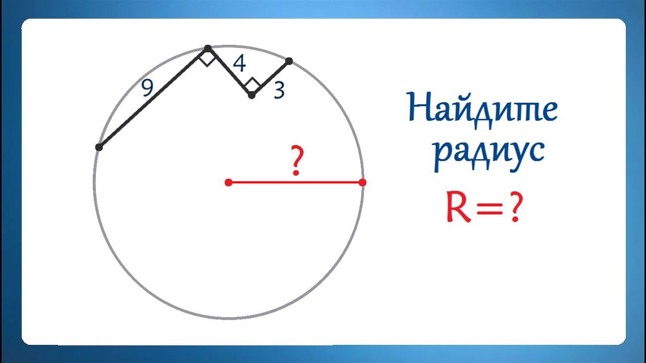 Звенья ломаной внутри окружности, равные 9, 4 и 3, пересекаются под прямым углом. Найдите радиус окружности. #сезонконтентаRUTUBE #RUTUBE Мой Дзен: https://dzen.ru/valeryvolkov Семейный Дзен: https://dzen.ru/irinablog Telegram: https://t.me/volkov_telegram Telegram 2: https://t.me/zhena_muzha_uchit Группа ВК: https://vk.com/volkovvalery Ютуб: https://www.youtube.com/valeryvolkov Почта: uroki64@mail.ru