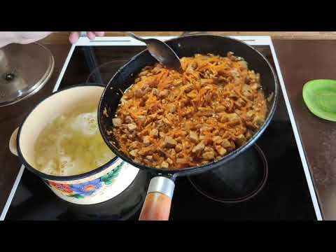 Мясо свинина 300 гр. Грибы Лисички 100- 150 гр. Лук половина средней головки. Чеснок 5-7 зубчиков Морковь 3 средних Масло растит. для обжарки Картофель 5-6 шт маленьких Спагетти или вермишель горсть Паста томатная 1 ст. л. Вода 3.5 л.