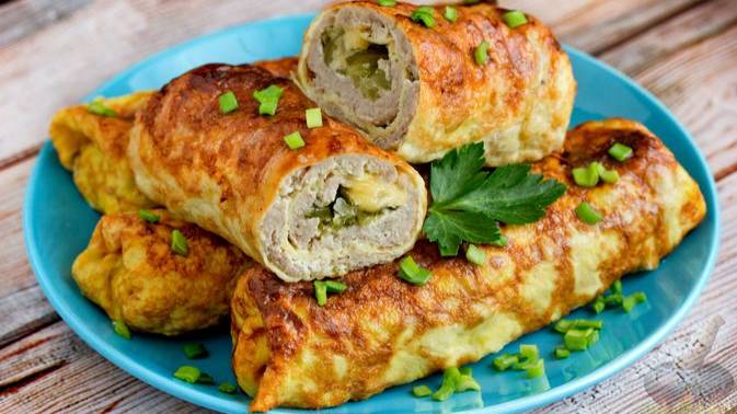 Омлетно-мясные рулетики. БРИЗОЛИ С МЯСНЫМ ФАРШЕМ, СОЛЁНЫМИ ОГУРЦАМИ И СЫРОМ (В ДУХОВКЕ)