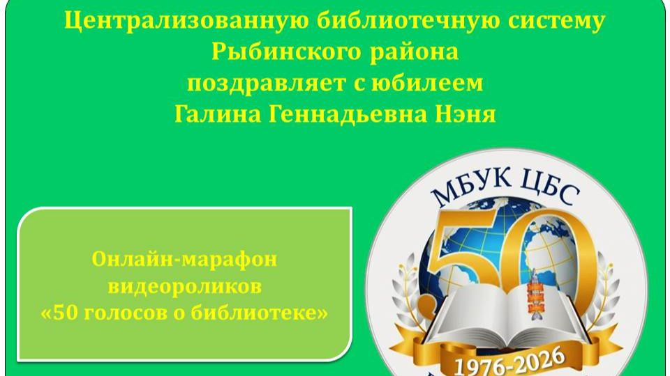 Дорогие друзья! В рамках онлайн-марафона видеороликов «50 голосов о библиотеке» постоянный читатель центральной районной библиотеки и активная участница встреч клуба общения «Огонёк» Галина Геннадьевна Нэня сердечно поздравляет Централизованную библиотечную систему Рыбинского района с 50-летием. Мы искренне благодарим Галину Геннадьевну за тёплые пожелания, которые вдохновляют двигаться только вперёд! А мы напоминаем, участниками онлайн-марафона могут стать жители Рыбинского муниципального округа любой возрастной категории от 3 лет и старше и рассказать о своей библиотеке, которую он посещает. Видеоролик может быть представлен в формате поздравления, воспоминаний, теплых слов в адрес библиотек и их работников. Видеоролики направляются на электронный адрес организатора kharitonova.2010@mail.ru для дальнейшего их размещения в официальных группах социальных сетей «ВКонтакте» clck.ru/3Rjfve и «Одноклассники» clck.ru/3Rjfvh #Крайвысокойкультуры #ЦентральнаяРайоннаябиблиотека #БиблиотекиРыбинскогорайона #Рыбинскийокруг #Онлайн_марафон_юбилей_ЦБС_50лет
