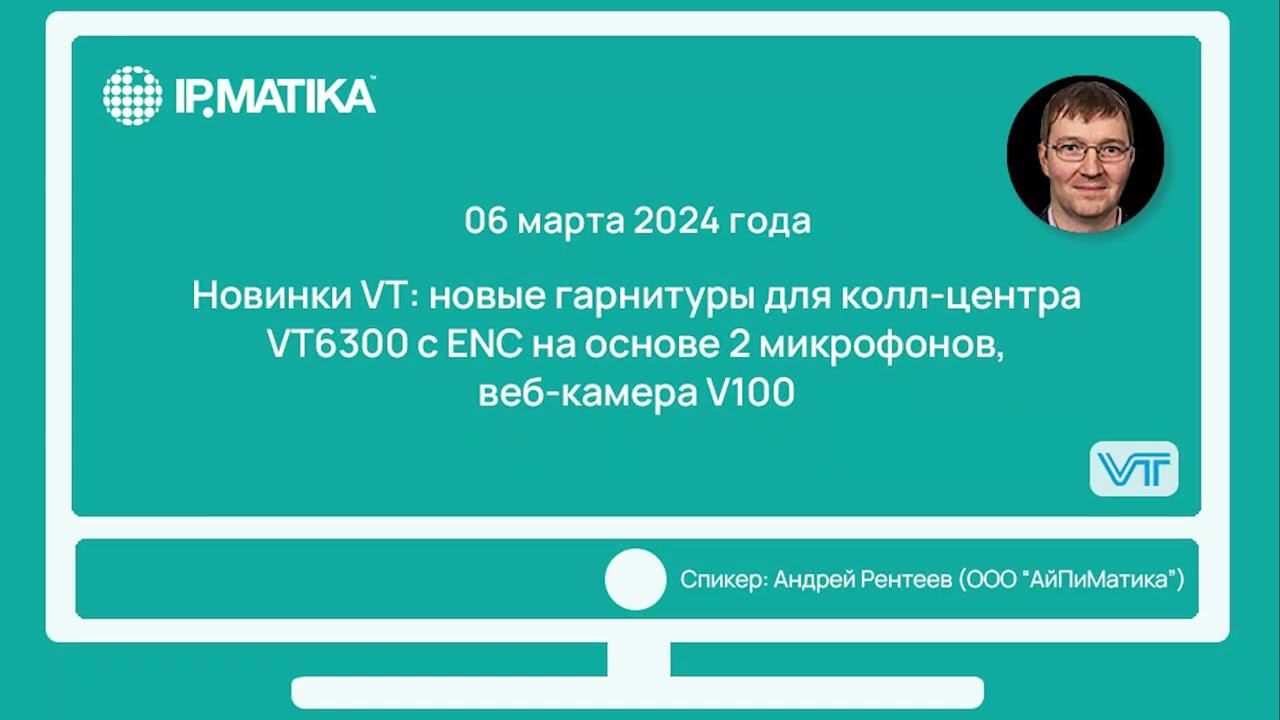 06 марта 2024 года продакт-менеджер компании АйПиМатика Андрей Рентеев провел вебинар "Новинки VT: новые гарнитуры для колл-центра". В программе вебинара: • о компании VT; • на что ориентироваться при выборе гарнитуры для КЦ; • новые бюджетные гарнитуры серии VT5000; • новые гарнитуры с ENC VT6300; • новая гарнитура с активным шумоподавлением ANC VT B320; • новая веб-камера V100 для "удаленки"; • реализованные проекты.