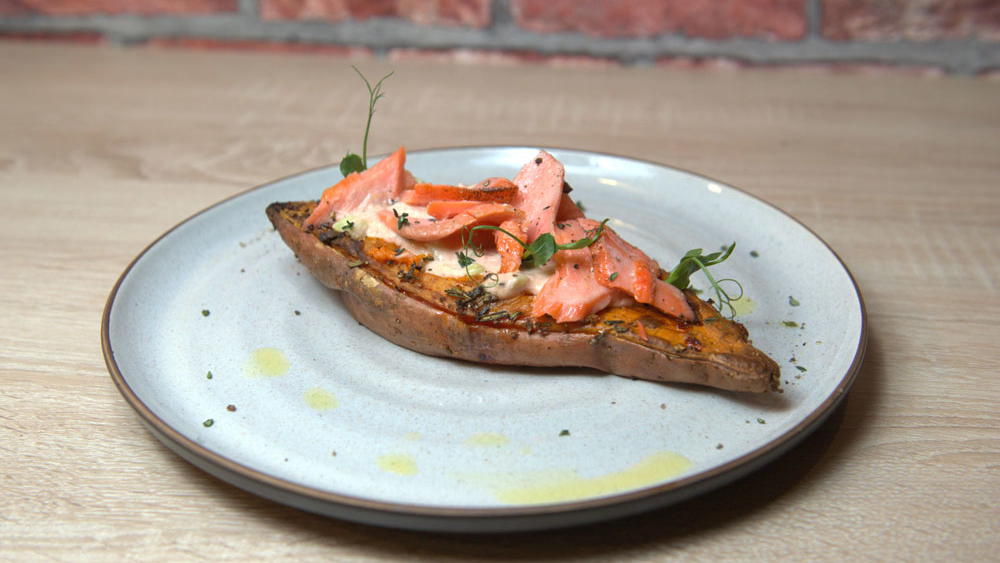 Запеченный батат с начинкой из копченого лосося. Роллы из цуккини