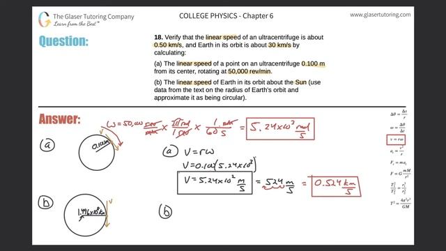 Verify that the linear speed of an ultracentrifuge is about 0.50 km/s, and Earth in its orbit is about 30 km/s by calculating: (a) The linear speed of a point on an ultracentrifuge 0.100 m from its center, rotating at 50,000 rev/min. (b) The linear speed of Earth in its orbit about the Sun (use data from the text on the radius of Earth’s orbit and approximate it as being circular). OpenStax™ is a registered trademark, which was not involved in the production of, and does not endorse, this product. If you don't have the OpenStax™ "College Physics" textbook, here is a link in which you can download it for FREE! https://d3bxy9euw4e147.cloudfront.net/oscms-prodcms/media/documents/CollegePhysics-OP.pdf SUBSCRIBE if you'd like to see more solutions for your textbook! https://www.youtube.com/channel/UC2C34WdYMOm47PkWovvzLpw?sub_confirmation=1 Want us as your private tutor? Get started with your FREE initial assessment! https://glasertutoring.com/contact/ #CentripetalAcceleration #CircularMotion #OpenStaxPhysics