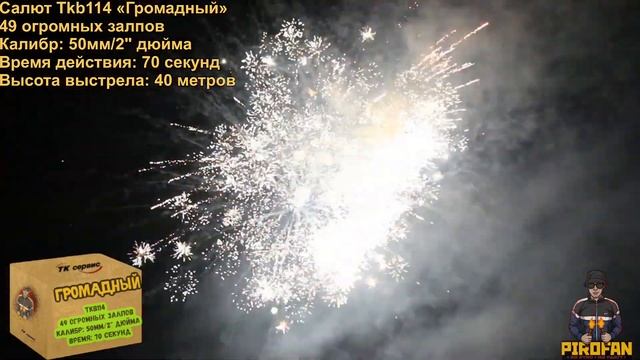 PiroFan - Лучшая пиротехника по Лучшим ценам Лучшим людям Салют, фейерверк "Громадный" Tkb114 -49 огромных залпов -Калибр: 50мм/2" дюйма -Время действия: 70 секунд -Высота выстрела: 40 метров -Срок годности до 2026 года -Есть сертификат -Гарантия на товар Магазин: PiroFan.ru Магазин VK: vk.com/PiroFan Instagram: Instagram.com/pirofans Whats App: +7 963 613-16-93 -Все наши салюты подлежат обязательной сертификации -Уточнить наличие/Заказать/Полная консультация профессионалов +7 963 613-16-96, в личные сообщения группы, администратор сообщества -Наш адрес: Москва, Метро Новогиреево, Саянская 11 корпус 1 -Осуществляем доставку по всей России