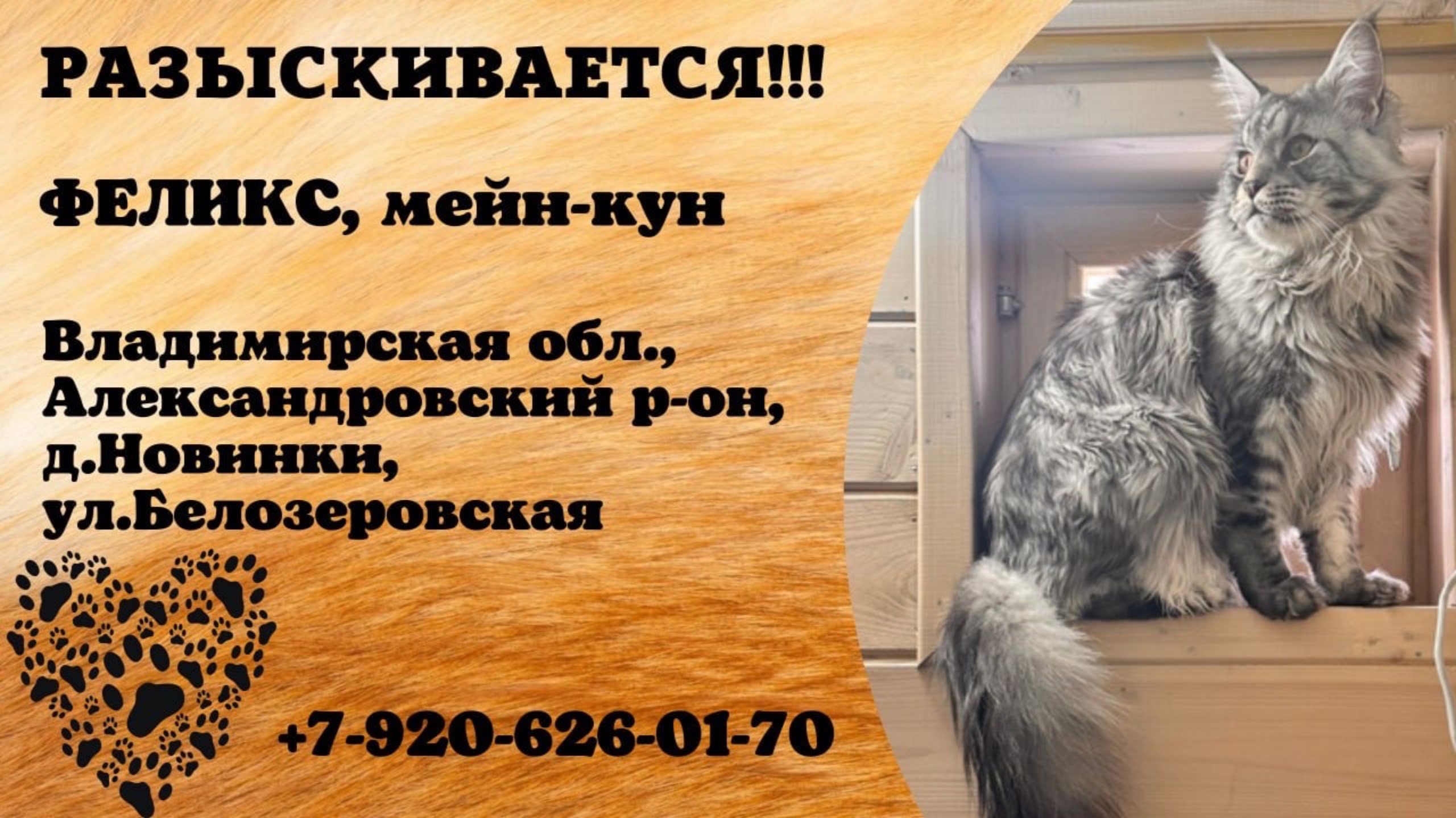 Пропал кот! ФЕЛИКС, мейн-кун. Владимирская обл., Александровский р-н, д.Новинки.
