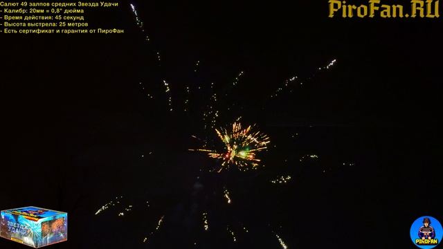 https://avito.ru/brands/PiroFan - ОФИЦИАЛЬНЫЙ магазин Русской компании ПироФан Салют 49 залпов средних, фейерверк Звезда Удачи - Калибр: 20мм = 0,8" дюйма - Время действия: 45 секунд - Высота выстрела: 25 метров - Есть сертификат и гарантия от ПироФан