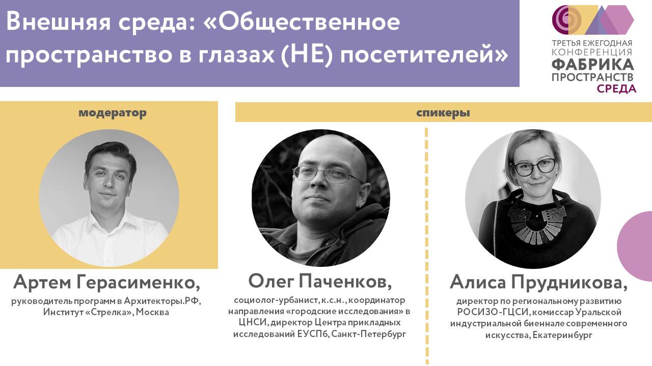 «Внешняя и внутренняя среда» Внешняя среда. Общественное пространство в глазах (НЕ) посетителей. В первый день конференции "Фабрика пространств. Среда" на площадке "Внешняя среда" мы обсуждали сложившиеся стереотипы в восприятии общественных пространств, на которые влияют традиции, недавняя советская история, государственная политика в сфере культуры и многое другое. А также оценивали запросы и ожидания аудитории от современных общественных пространств. Какими нас хотят видеть, даже если привыкли видеть по-другому? Каких инноваций и изменений требуют? Каких сервисов ждут? Какие концепции пространств сегодня работают лучше других и почему? В дискуссии приняли участие: 🎙Олег Паченков, социолог-урбанист, к.с.н., координатор направления «городские исследования» в ЦНСИ, директор Центра прикладных исследований ЕУСПб 🎙Алиса Прудникова, директор по региональному развитию РОСИЗО-ГЦСИ, комиссар Уральской индустриальной биеннале 🎙Модератор - Артем Герасименко, руководитель образовательной программы Архитекторы.рф, реализуемой Институтом «Стрелка», основатель проектного бюро Urban Street 14 и Центра спортивной инклюзии «Здоровые города»