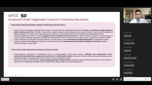 Спикер: - Матвеенков Константин, директор по устойчивому развитию, Eurasia Development Corporate Group. Программа вебинара: 1. Классификация и тренды быстровозводимого строительства в Китае (стальное, деревянное, железобетон); 2. Доля введенных в эксплуатацию быстровызводимых зданий, рост площади строительства на основе стали; 3. Разбор производственной сбытовой цепочки металлоконструкций (производители, застройщики); 4. Государственная поддержка быстровозводимого и стального строительства в Китае: - на национальном уровне - на региональном уровне - основные особенности поддержки (многоуровневость, многосторонность и разнообразие инструментов); 5. Сравнительный анализ китайских мер поддержки быстровозводимого и стального строительства с дорожными картами РФ в области строительства; 6. Рекомендации по продвижению стального строительства в России на основе китайского опыта.