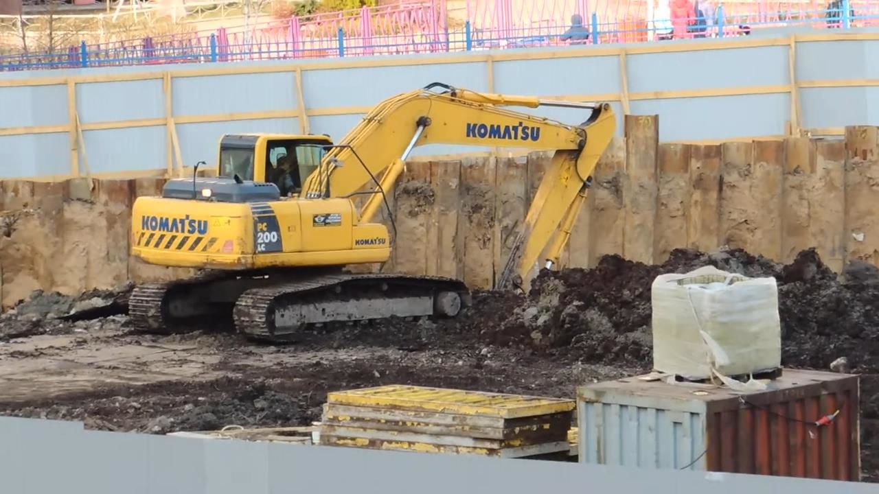Экскаватор гусеничный выкапывает яму под фундамент на стройке.