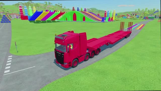 МУЛЬТИКИ ДЛЯ МАЛЫШЕЙ С ГРУЗОВИКАМИ. КРАСОЧНЫЙ АВТОВОЗ ПЕРЕВОЗИТ АВТОБУС И БЕТОНОМЕШАЛКУ.