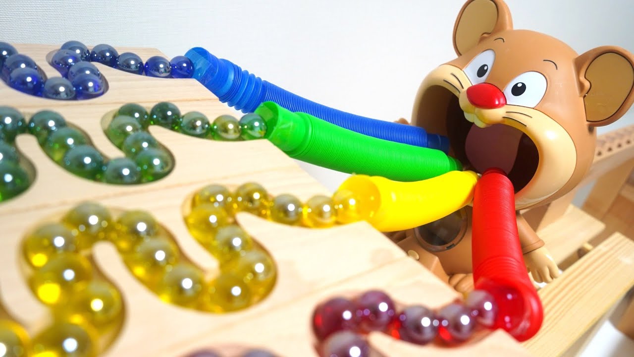 Скатываем разноцветные шарики с горки прямо в рот мышонку играем вмести с детьми. Видео для развития детей