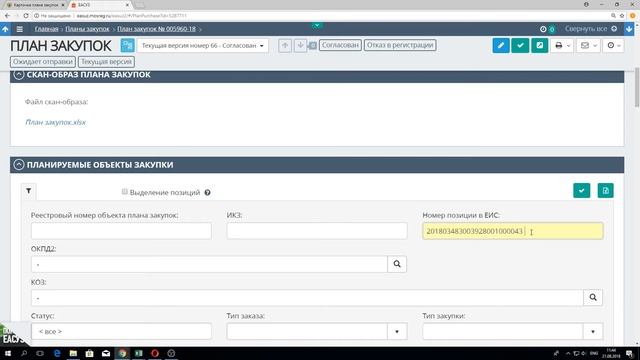 Блок «Основание внесения изменений в позицию плана закупок» (commonInfo\positionModification) должен быть указан, в случае если в поле «Статус позиции при приеме изменений плана закупок» (positionModificationStatus) указано значение «E»