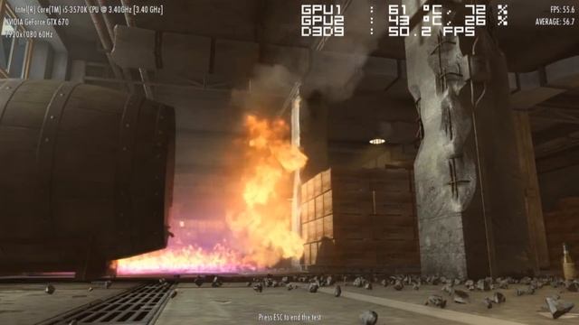 With Fraps: 51 fps Without Fraps: 69 fps For comparison, one Nvidia Titan gets 68 fps Fraps settings: Full-size (1080p), 30 fps Song: Hassaan Mackey, Apollo Brown - Elephants PC specs: i5-3570k 3.4 GHz, turbo boost to 4.4 8 GB Corsair 1600 MHz RAM Gigabyte GA-Z77X-D3H Mobo Corsair 400R Case (2) MSI Power Edition GeForce GTX 670 2GB Video Cards Intel 240 GB SSD Win7 Home Premium 64-bit Benchmark ran on January 14, 2013