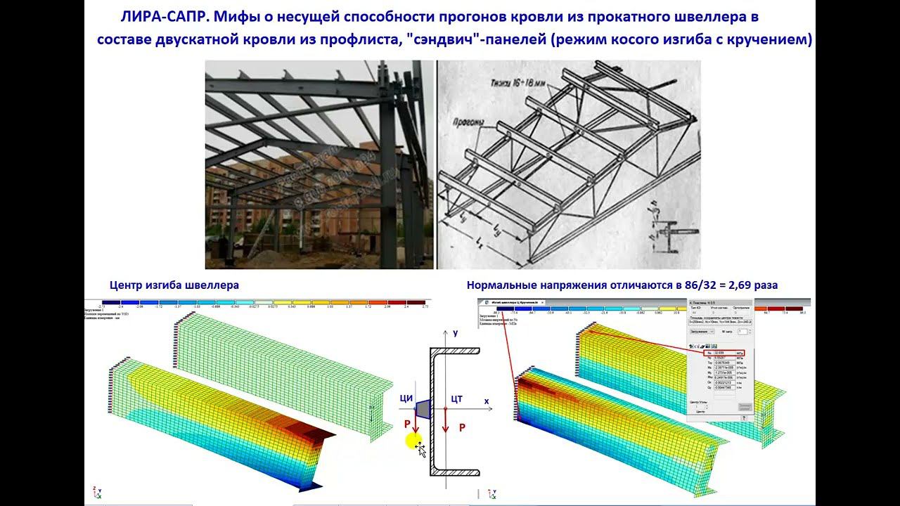 ЛИРА-САПР. Мифы о несущей способности прогонов кровли из прокатного швеллера (косой изгиб с круч.).