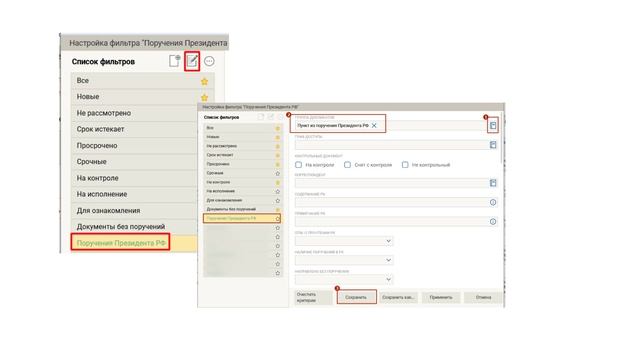 Настройка фильтра "Поручения Президента РФ" в папке кабинета пользователя СЭД Дело