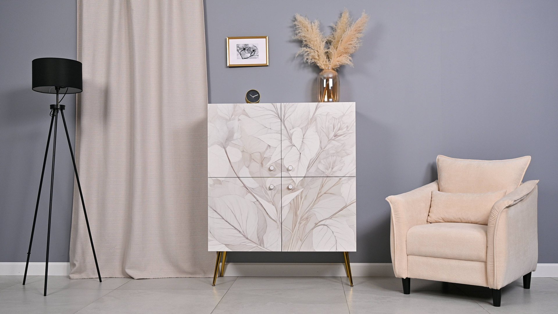 Шкаф Флоу 16.329 выделяется растительным принтом на фасаде, создающими свежий и стильный акцент в интерьере. Металлические ручки и опоры с регулировкой придают конструкции надежность и современный вид. Вместительные отделения, петли с доводчиком и скрытая задняя стенка обеспечивают удобство хранения и аккуратный внешний вид. Габариты: 1059 х 430, В 1312 мм Расцветка: Кашемир 5981 BS, Белый PE шагрень.