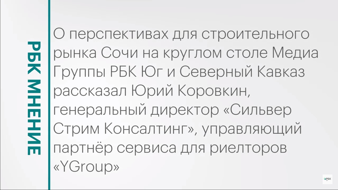 О перспективах для строительного рынка Сочи на круглом столе Медиа Группы РБК Юг и Северный Кавказ рассказал Юрий Коровкин, генеральный директор «Сильвер Стрим Консалтинг», управляющий партнёр сервиса для риелторов «YGroup». Подписывайтесь на нас в социальных сетях: ВКонтакте: https://vk.com/rbcyug Telegram: https://t.me/rbc_krasnodar, https://t.me/rbcrostov, https://t.me/rbc_kavkaz Подпишитесь на канал РБК Юг, чтобы смотреть новые выпуски первыми!
