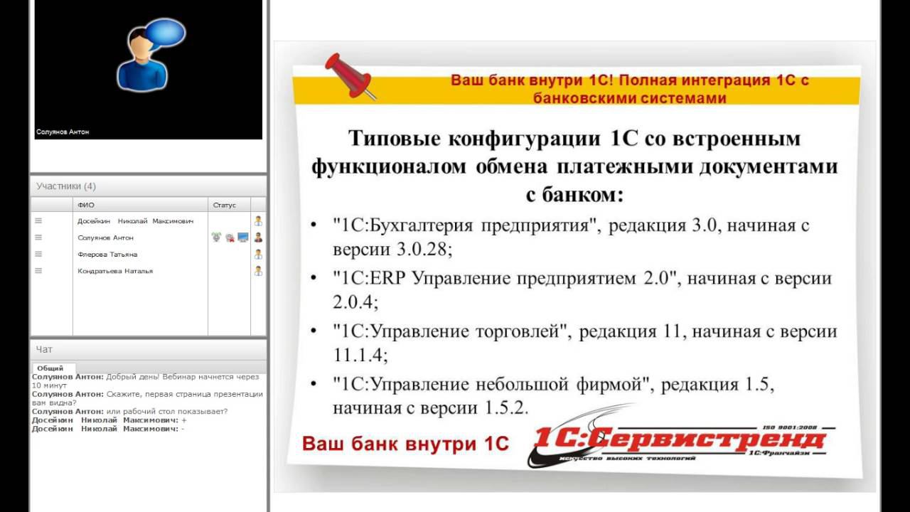 a) Банк- клиент или 1С? Обзор текущих технологий приема/отправки платежей. b) Прямой обмен платежными документами с банком – просто, удобно, надежно! c) Совместная работа технологий прямого доступа и выгрузки платежных документов d) Техническая поддержка и ответы на вопросы по решениям интеграции 1С.