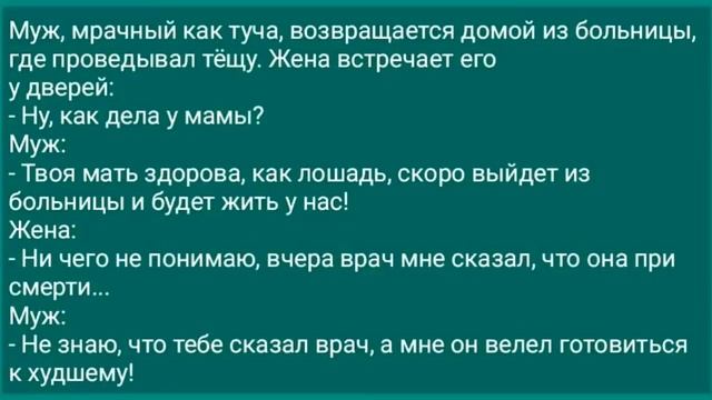 Муж, мрачный как туча, возвращается из больницы, где проведывал тещу. Жена встречает его у дверей...