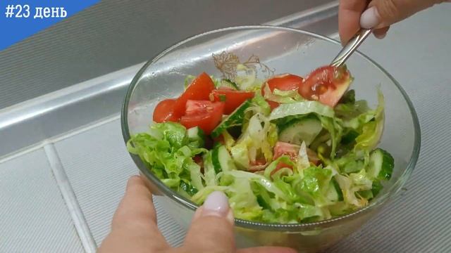 меню 23 дня 2 ломтика жареного или варёного мяса (около 200 гр.), 3 помидора, 2 огурца, 1 тост или четверть лепёшки, фрукты