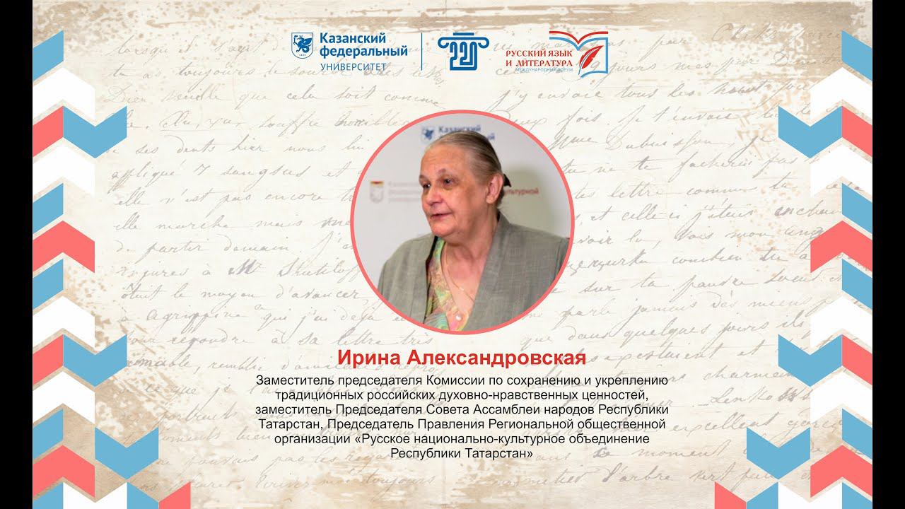 Ирина Александровская - заместитель председателя Комиссии по сохранению и укреплению традиционных российских духовно-нравственных ценностей, заместитель Председателя Совета Ассамблеи народов Республики Татарстан, Председатель Правления Региональной общественной организации «Русское национально-культурное объединение Республики Татарстан» о II международном форуме «Русский язык и литература как средство формирования российской идентичности и международной интеграции», проходившем в Институте филологии и межкультурной коммуникации Казанского федерального университета с 13 – 16 июня 2024 года