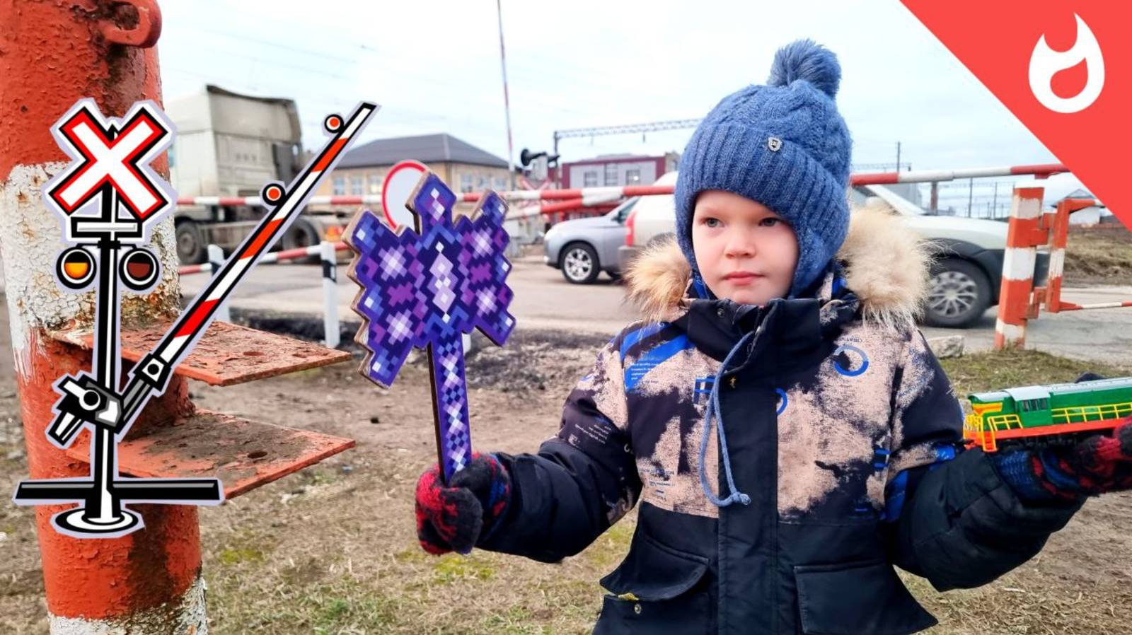Грузовые поезда на жд переезде зимой _Железнодорожный переезд со шлагбаумом